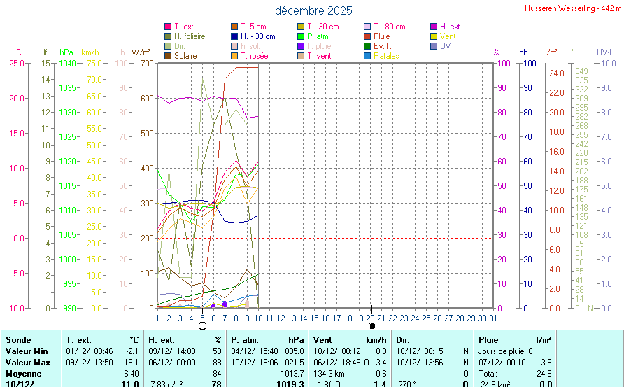 | Année - Journées d'été (Tmax >= 25°C) [an dernier] | 79 [86] | décembre - Journées d'été (Tmax >= 25°C) [an dernier] | 0 [0] |